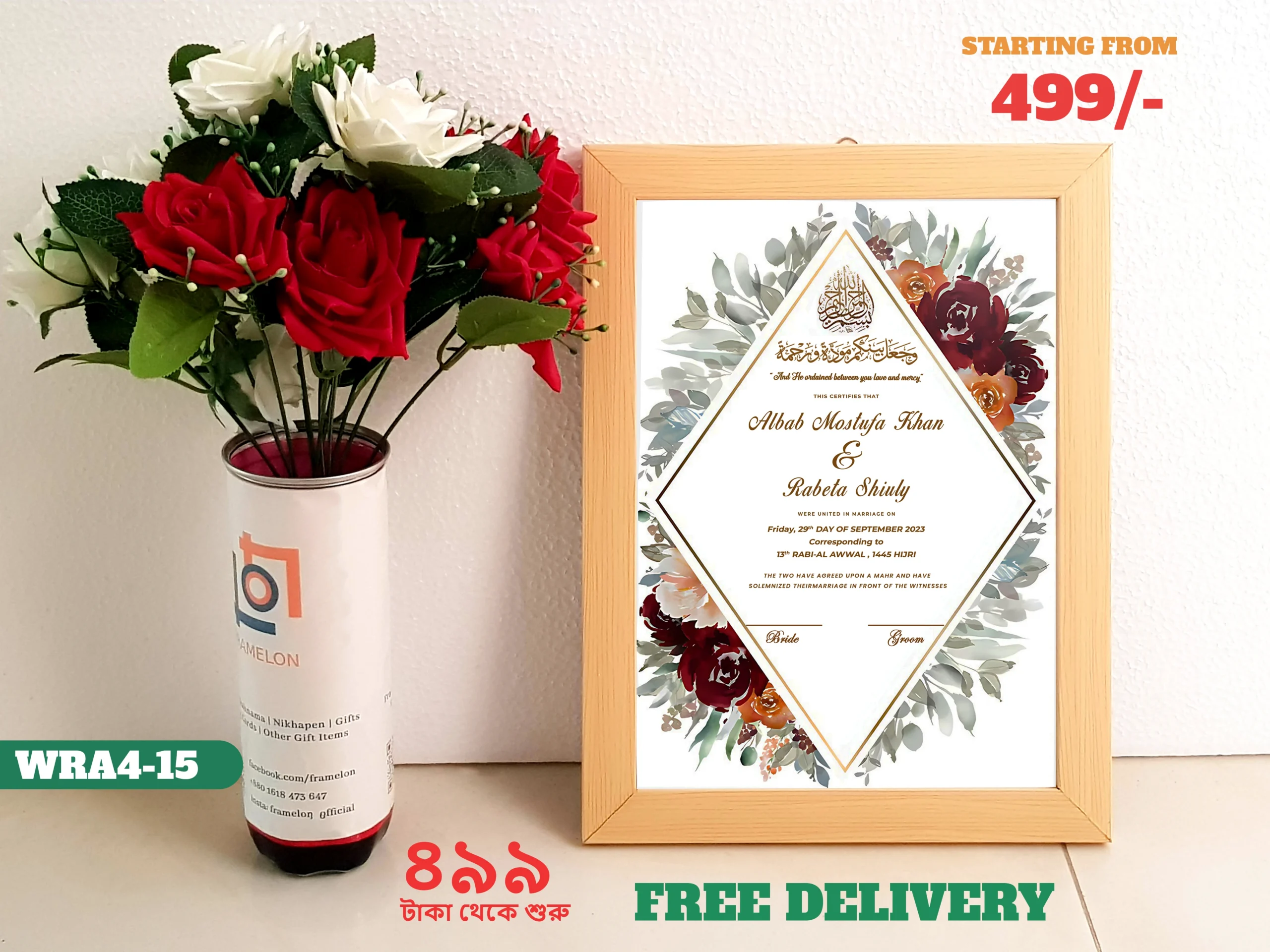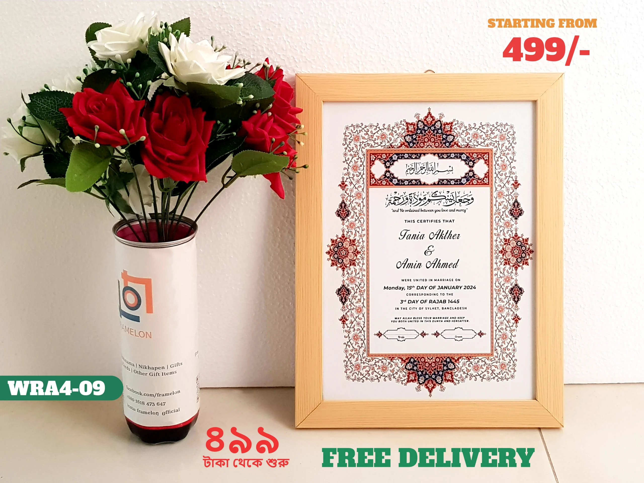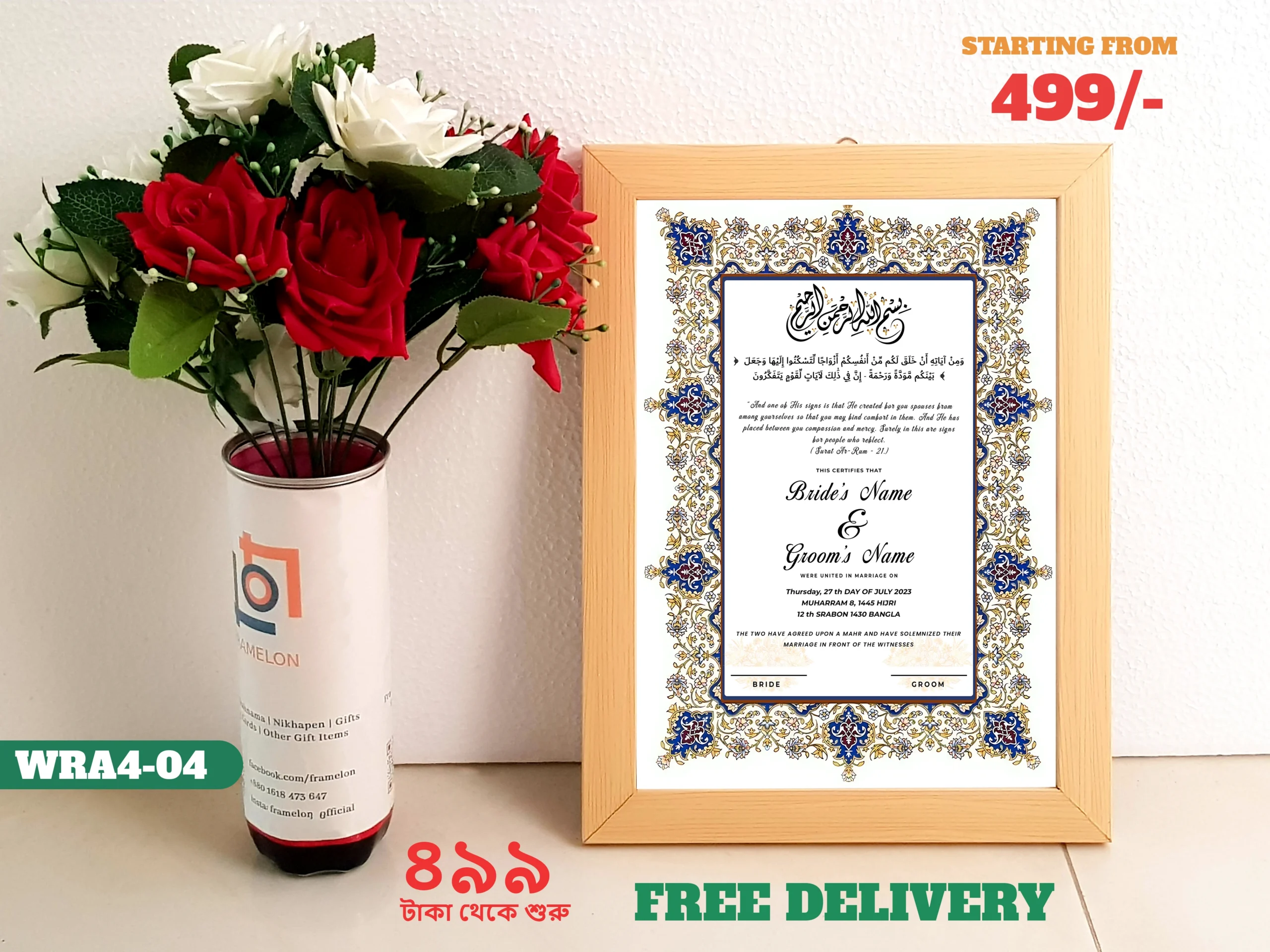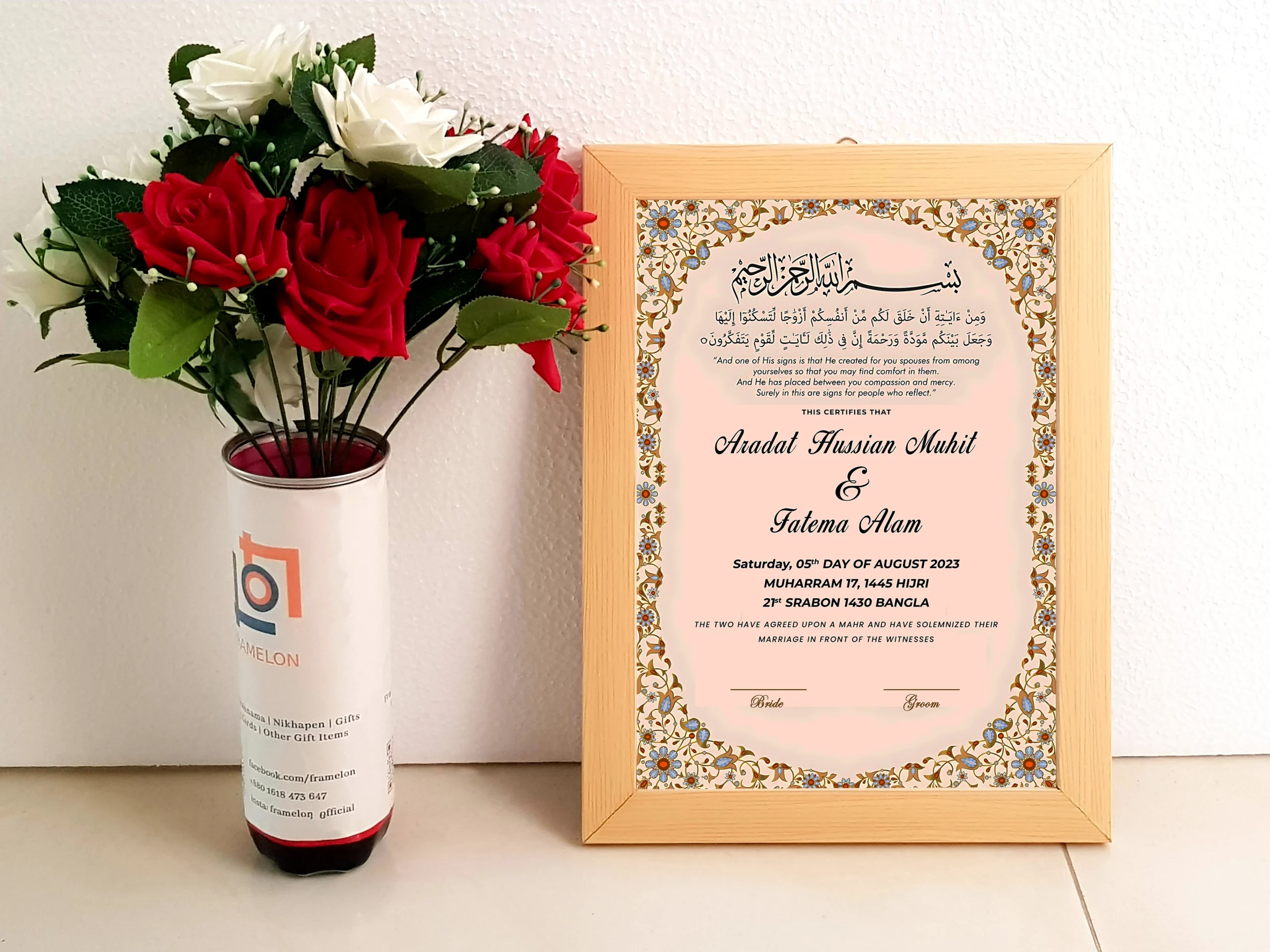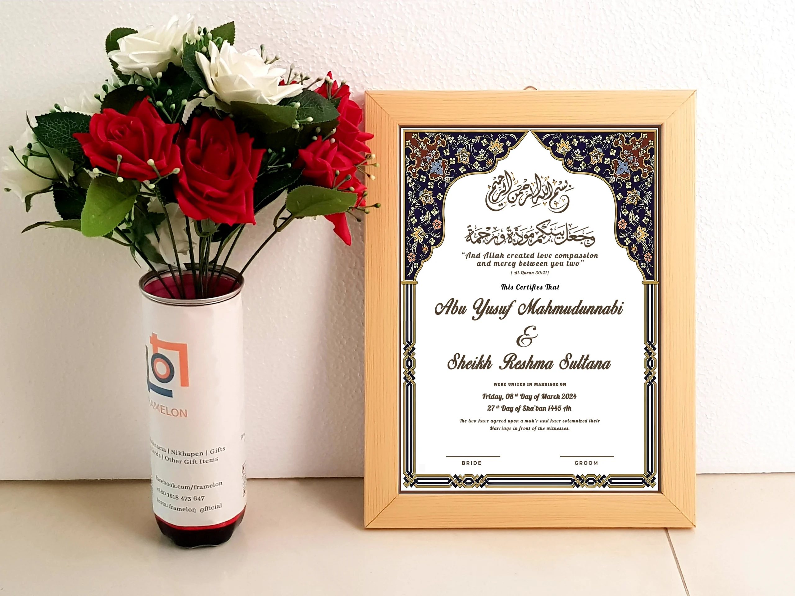 • Design: 13×9 inch customized personalized Nikah Nama, Marriage Certificate with picture frame, perfect for your wall decor, cherished memories; frame includes a white border and hanging hardware for hassle-free display in both horizontal and vertical formats to hang flat against the wall